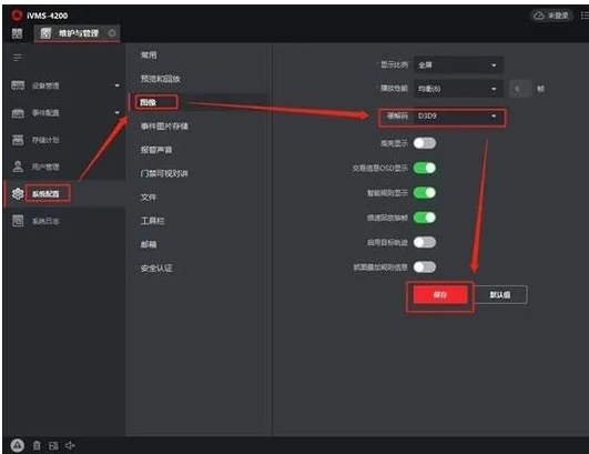 在4200客戶(hù)端開啓硬解碼:進(jìn)入系統配置—圖像—硬解碼選擇D3D9或D3D11,保存。
