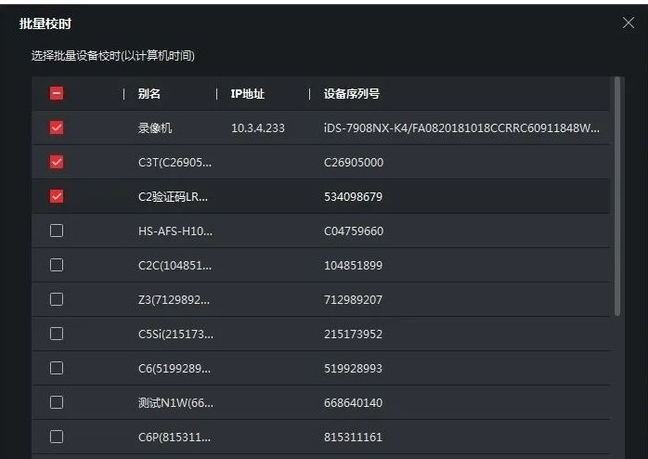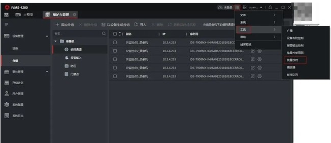 給我3秒給你搞定,右上角工具-批量校時,勾選需要校時的設備(bèi),點(diǎn)擊校時即可對設備(bèi)進行批量校時。