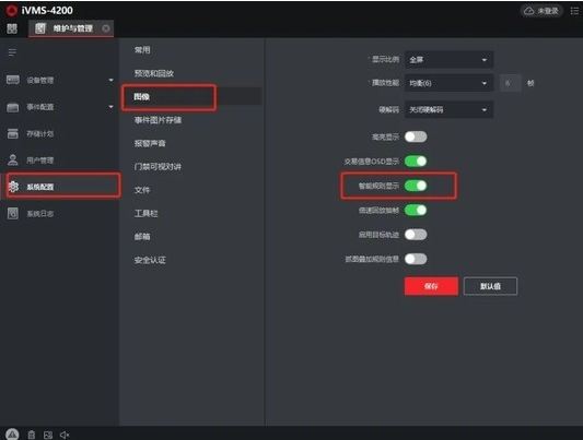 若您配置的是“區域入侵”、“人臉抓拍”等規(guī)則,需要規(guī)則框展示,需要在系統配置-圖像界面,将“智能規(guī)則顯示”開(kāi)啓~