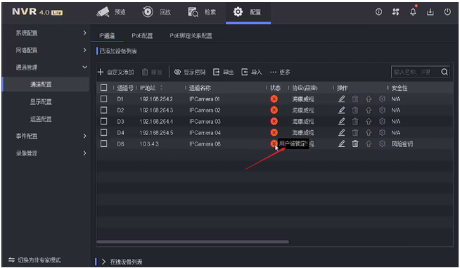 1、首先進入錄像機配置→通道管理→通道配置→IP通道,選擇提示用戶被鎖定的IP通道,點(diǎn)擊“删除”,删除該(gāi)通道。