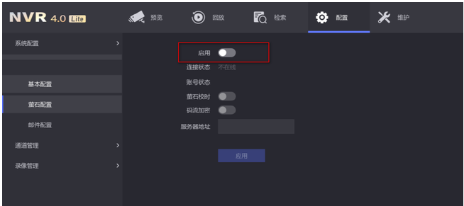 確(què)認錄像機的LAN口與路由器已用網線連接好。進入配置-網絡配置-螢石配置,確(què)認啓用螢石雲已經打鈎(gōu),驗證碼已經填好。驗證碼如果是空的,可自行填寫六位大寫英文字母(不能填寫ABCDEF)。