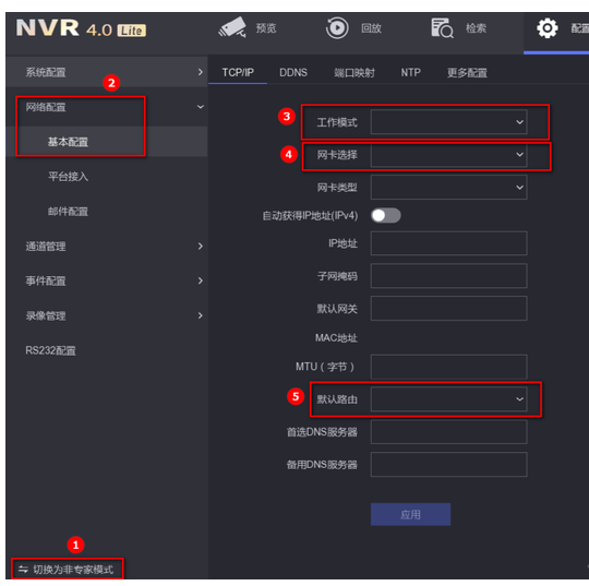 如果您使用的是雙網口錄像機,兩個(gè)網口均使用的情況下,配置界面先切換爲專家模式,進入網絡配置-基本配置界面,将工作模式切換爲多址設定模式,網卡選擇對(duì)應接入外網的LAN口, 設置跟路由同網段的IP地址、子網掩碼、默認網關、DNS服務器地址,注意默認路由選擇接入外網的LAN口。