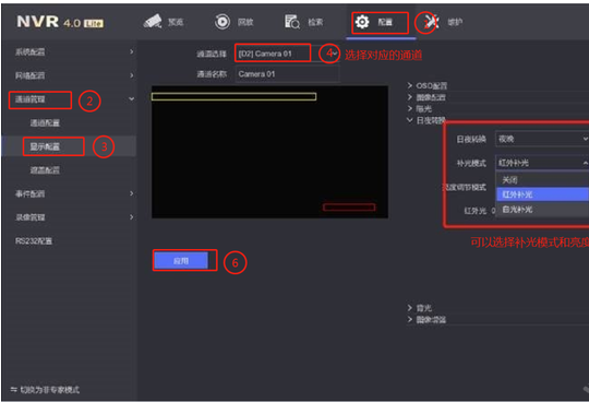 點擊錄像機左下角,切換爲專家模式,在配置-通道管理-顯示配置-日夜轉換中,可以選擇和設置攝像機補(bǔ)光模式,也可以調節補(bǔ)光燈(dēng)亮度。