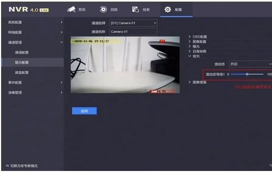 點擊錄像機左下角,切換爲專家模式,在配置-通道管理-顯示配置-背光中,選擇開啓寬動态,也可以根據現場(chǎng)光線環境選擇調整寬動态等級,範圍從(cóng)0-100,寬動态等級數值越大,畫面亮暗對比越明顯,點擊“應用”保存配置。