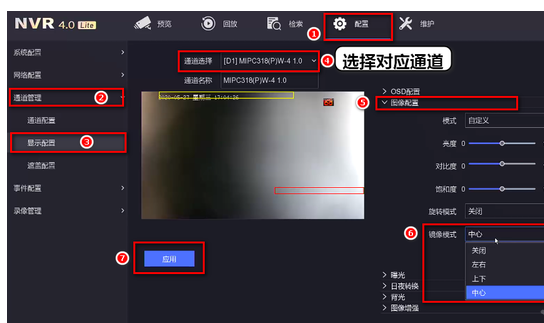 點擊錄像機左下角,切換爲專家模式,進入配置-通道管理-顯示配置界面,選擇對應通道,點擊圖像配置-鏡像,按實際場(chǎng)景選擇“關閉(bì)”、“上下”、“左右”、“中心”,點擊“應用”保存配置。