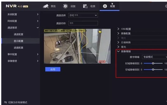 點(diǎn)擊錄像機左下角,切換爲專家模式,進入配置-通道管理-顯示配置界面,選擇對(duì)應通道,點(diǎn)擊圖像增強,可以選擇普通模式和專家模式兩種模式來選擇降噪等級。