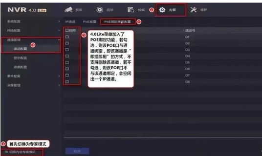 進入錄像機配置界面,切換爲專家模式,在通道管理-通道配置-PoE綁(bǎng)定關(guān)系配置中,可以開啓或解除通道的PoE綁(bǎng)定關(guān)系。