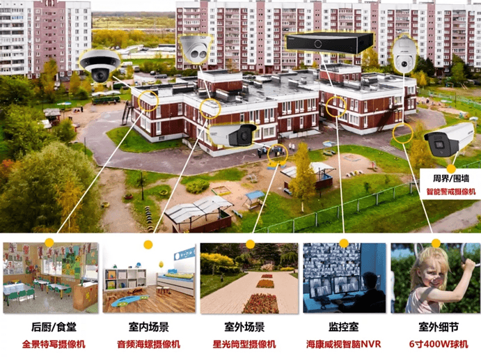 這套視頻監控系統可以實現對幼兒園的室内、室外活動場所、後廚、食堂、周界等,進行全面監控覆蓋。