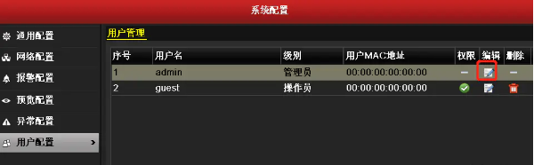 操作路徑:進入主菜單—系統配置—用戶配置,點擊編輯圖标修改密碼。