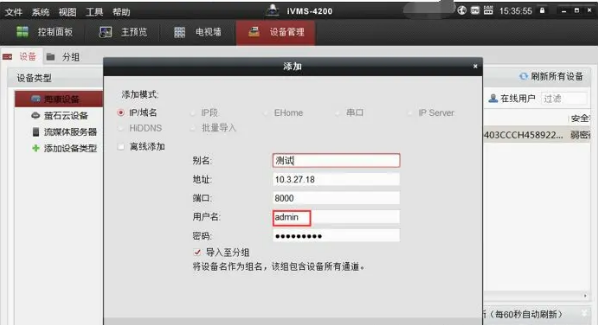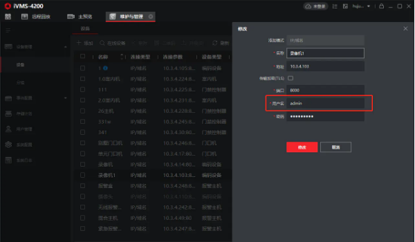 解決方法:4200添加設備(bèi)時需要輸入設備(bèi)的用戶名和密碼,而不是4200安裝注冊的賬号密碼。設備(bèi)用戶名默認admin,密碼是激活設備(bèi)時設置的密碼。可以将設備(bèi)删除,斷電重啓後,重新用正確(què)的用戶名密碼添加。