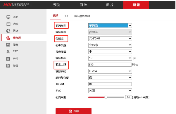 1、使用電腦ie浏覽器,輸入對應攝像機的IP,進入配置-視音頻-視頻,碼流類型點擊主碼流,選擇子碼流,修改對應碼流下的分辨率、碼率上限,點擊“保存”。