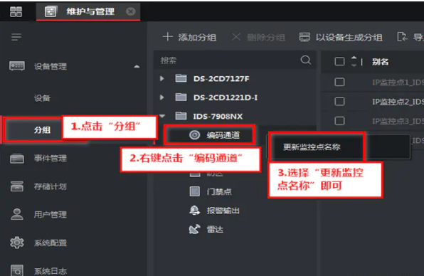 進入維護與管理—設備(bèi)管理—分組,選擇對應分組—編(biān)碼通道,鼠标右鍵選擇更新監控點名稱。