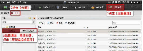 4200客戶端—設備(bèi)管理—分組—編碼通道—選中對應監控點,再點擊修改—修改名稱—確(què)定。
