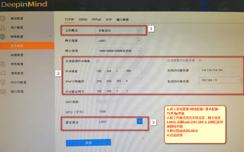 将路由器連接LAN1,進入錄像機主菜單(dān)—系統配置—網絡配置—基本配置界面,将工作模式改爲”多址設定”,網卡選擇LAN1,設置LAN1IP地址爲192.168.1.100以及其他網絡參(cān)數,默認路由選擇LAN1,點擊“應用”。