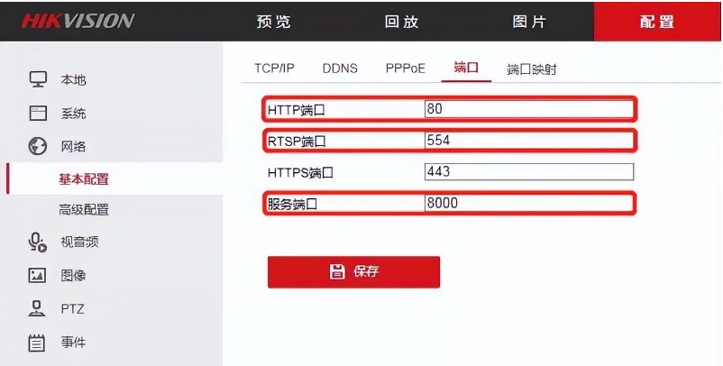 a)網頁訪(fǎng)問攝像機IP,進入“配置—網絡—基本配置—端口”界面,查看HTTP、RTSP、服務器端口分别是多少。這三個(gè)端口就是需要到路由器裏面映射的端口。