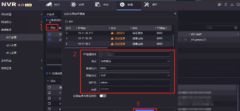 NVR4.0lite錄像機(jī)菜單(dān)頁面“自定義添加”攝像機(jī)路徑: