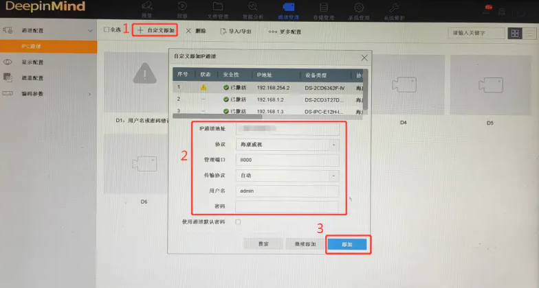 NVR3.0錄像機(jī)菜單(dān)頁面“自定義添加”攝像機(jī)路徑:
