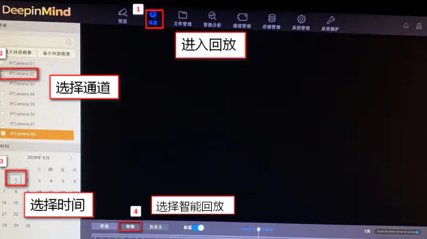 進(jìn)入主菜單(dān)—回放界面,選擇”智能回放”模式。
