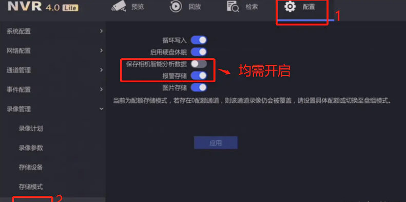 路徑:專家模式下,進入配置—錄像管理—高級配置—開啓相機智能分析數據後(hòu)點(diǎn)“應用”。