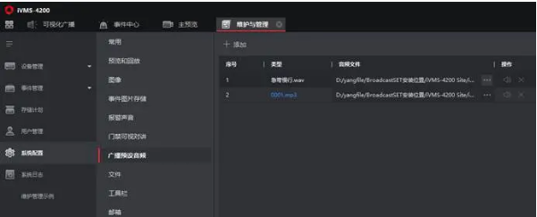 在維護(hù)與管理-系統配置-廣(guǎng)播預設音頻可以添加音頻文件(支持音頻格式:MP3、WAV,最多8條音頻)