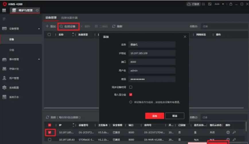 進入維護與管理界面,點(diǎn)擊在線設備(bèi),搜索同一局域網設備(bèi),選擇搜索到設備(bèi),點(diǎn)添加