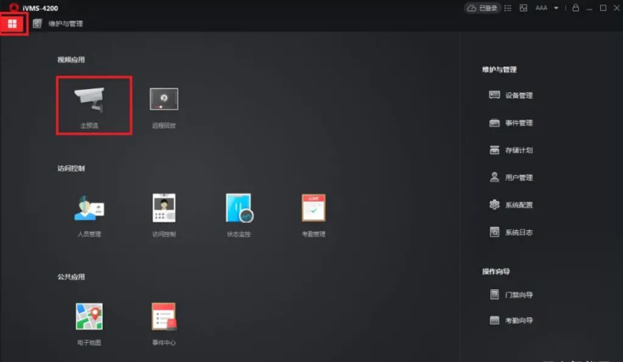 設備(bèi)添加成功後,點(diǎn)擊左上角圖标,然後點(diǎn)擊主預覽進入軟件預覽界面