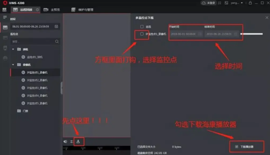 如果想要同時下載多個監控點(diǎn)的錄像文件,直接點(diǎn)擊左下角下載圖标,選擇對(duì)應的監控點(diǎn)和時間下載。