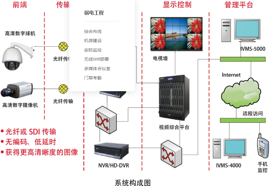 Ⅱ.傳(chuán)輸部分;使用網線、光纜、電線等,採(cǎi)取架空、地埋或沿牆敷設等方式傳(chuán)輸視頻、音頻或控制信号等。
